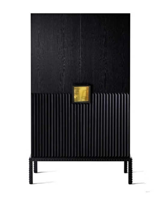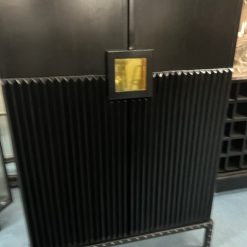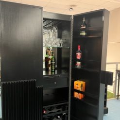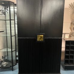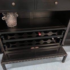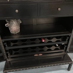 The Azura Bar Cabinet is made from strong and sturdy mahogany solid wood. It has a unique design with angled timber paneling at the front and a square metal handle. It’s painted in a sleek black color that adds a touch of sophistication to your home.