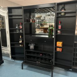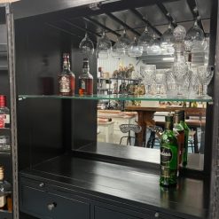 Mirror Back Inside with glass shelf, wooden stemware holders, full length pull out table for drinks preparation, two storage drawers,180° full-length piano hinge allows doors to open wide for easy access to storage.