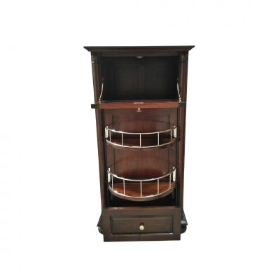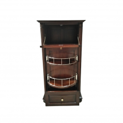 Home Bars brings this dignified bar cabinet for indoors, your home will be oozing with functional solutions and timeless elegance. The cabinet is made of Mahogany wood, offering a square top, a cubic compartment with a glassware rack and a pull-down door, 2 circular rotating shelves, and 2 drawers at the bottom for storing bottles of wine.