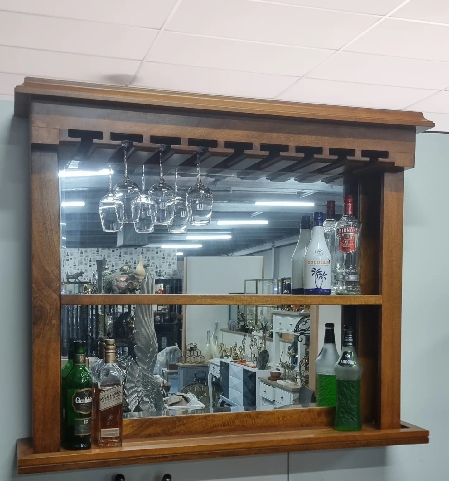 Victoria Back Bar Mirror Shelf is crafted from solid Mahogany hardwood frame design. From modern to classic to romantic playful, all these attributes fit on the offered bar mirror drinks shelf, With these you can set beautiful accents in every house or apartment. In addition, a space thanks to an ideally placed Bar mirror look bigger and can hold lots of bottles as double shelf display.Display your Whiskey and Liquor bottles on the mirror back shelf. Hang the stem glasses on top.