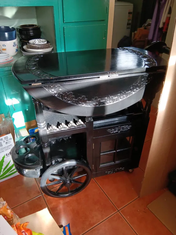 Art Deco Flip open top Bar Cart lots of feature. I bet you haven’t seen one like this. An Elegant and beautiful design made of Solid Wood.