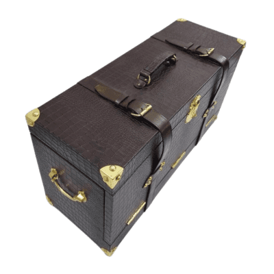Meet the Field Bar – a carefully made and stylish bar perfect for your drinks. It’s designed with a mix of shiny brass and textured crocodile-patterned leather, inside red velvet to keep bottles safe and making it a standout piece.