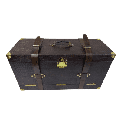 Armored with brass corners and a single lock at the front, along with tough leather straps on both sides, this bar ensures secure closure during transport, making it a reliable travel companion.