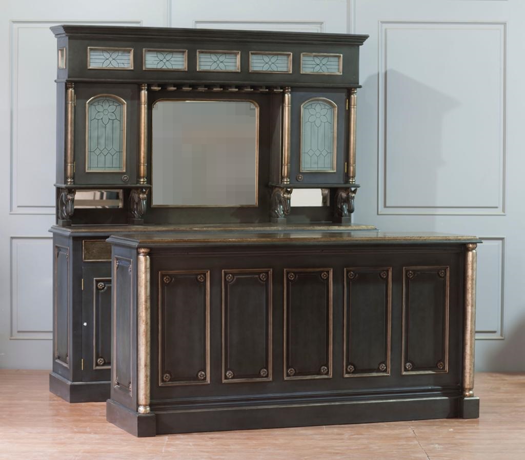 Channel your inner alcohol aficionado with this mahogany wood based back bar cabinet and front bar counter table. The mirrored back, stemware holders, and space for a wine cooler make it a perfect bar to any room. Display your collection with pride and entertain your friends with love.